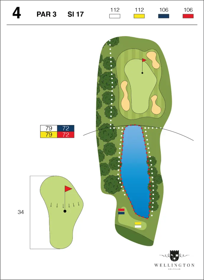 De green van hole 4 bevindt zich achter een vijver en rechts van een hoge berm. Achter deze berm kan u beter niet ‘liggen’, het is het ‘oud kerkhof’ van Oostende.