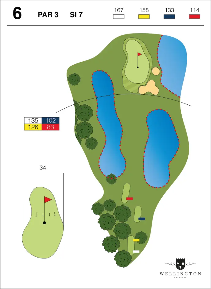 Maar concentreer u vooral op uw spel, de green wordt beschermd door 3 vijvers.