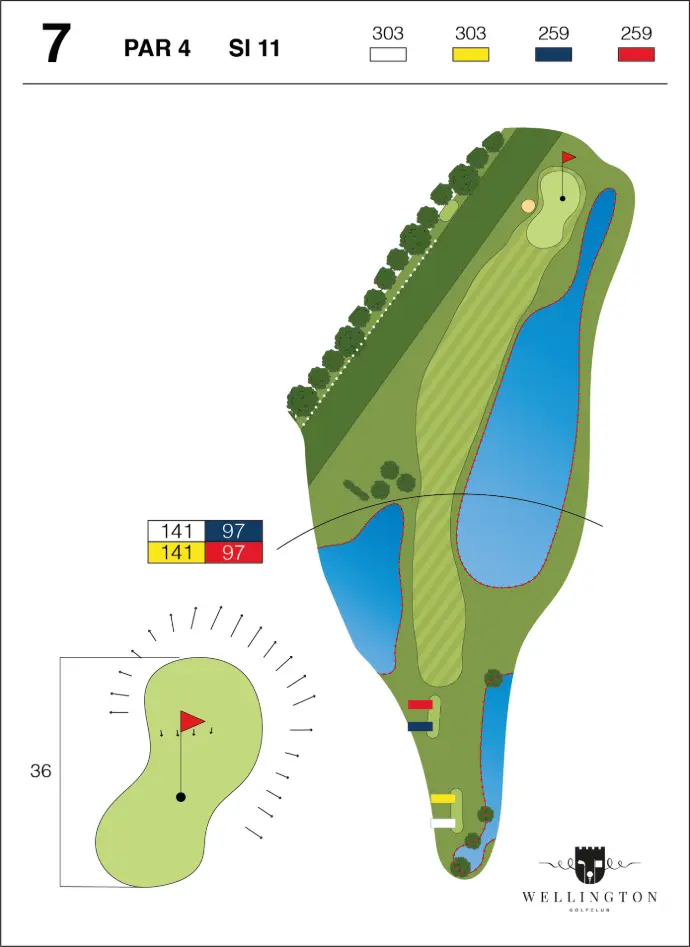Hole 7 ligt tussen 2 van onze 11 vijvers. Uw skills op het vlak van richting worden hier danig op de proef gesteld. In 2021 werden er 17.000 ballen uit de vijver gevist.